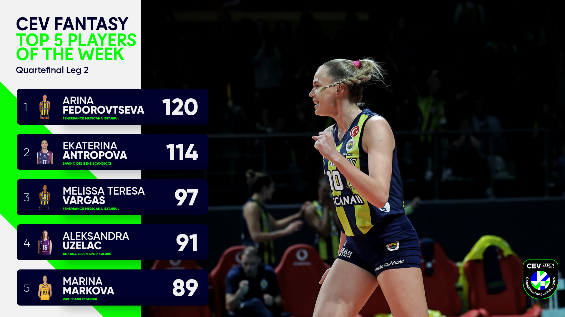 Behind them, Melissa Teresa Vargas collected 97 points after another strong performance, while Aleksandra Uzelac added 91 points for ANKARA Zeren Spor Kulübü. Completing the top five is Marina Markova with 89 points, rounding off an important week for VakifBank Istanbul.