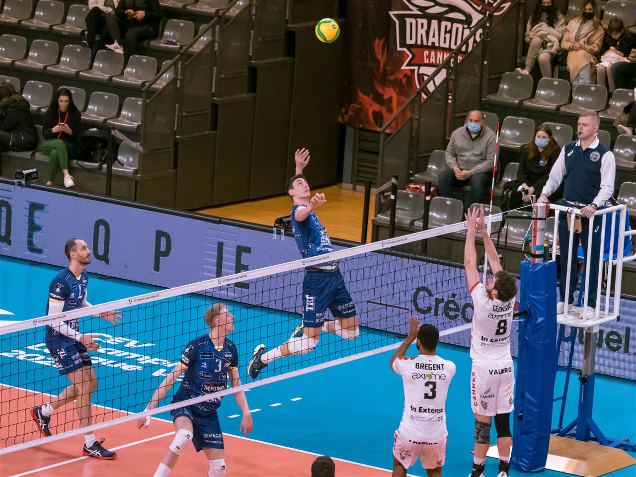 When the match started AS CANNES Dragons (FRA) was looking for its first victory in the competition and had 650 fans by their side. The first set was very equal, but TRENTINO Itas (ITA) scored 1-0 mostly due to a slight advantage on Winning Spikes (20-15).